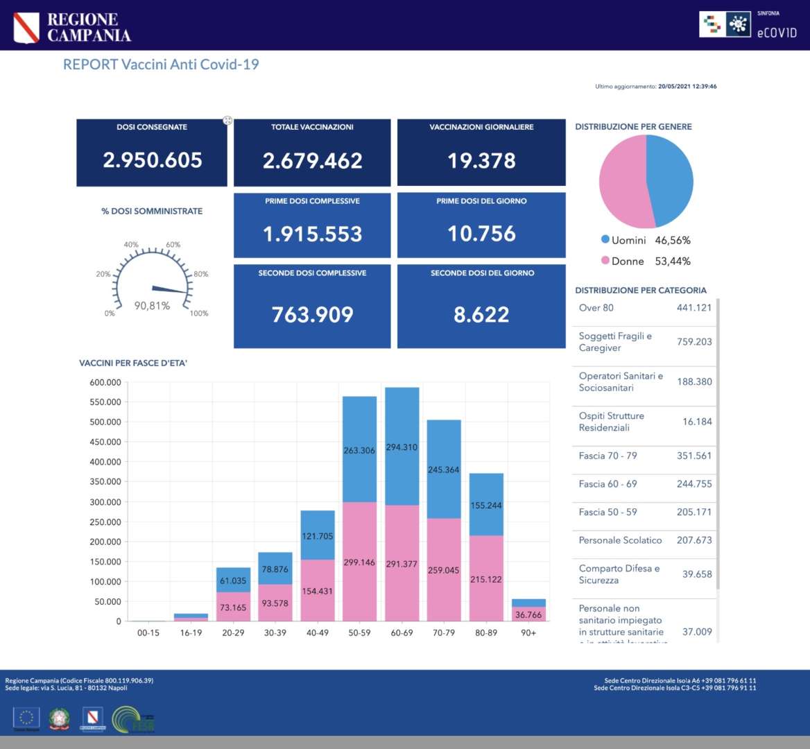 Come si vede anche dalla piattaforma, i dati di sintesi delle vaccinazioni in Campania aggiornati alle ore 12.30 del 20 maggio 2021 sono i seguenti: