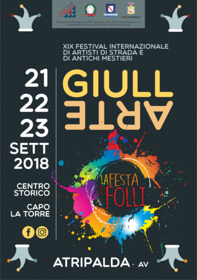 Una contaminazione di atmosfere gotiche e metropolitane, teatro, giocoleria, magia, personaggi, suoni, maschere e richiami letterari per una tre giorni dedicata all’arte di strada, una sarabanda di colori che animerà il centro storico Capo La Torre di Atripalda. La fantasia al potere per la Festa dei Folli di Giullarte, evento storico per la Città del Sabato che quest’anno è stato cofinanziato dal POC Campania 2014-2020, Linea strategica 2.4 “Rigenerazione urbana, Politiche per il turismo e cultura”.