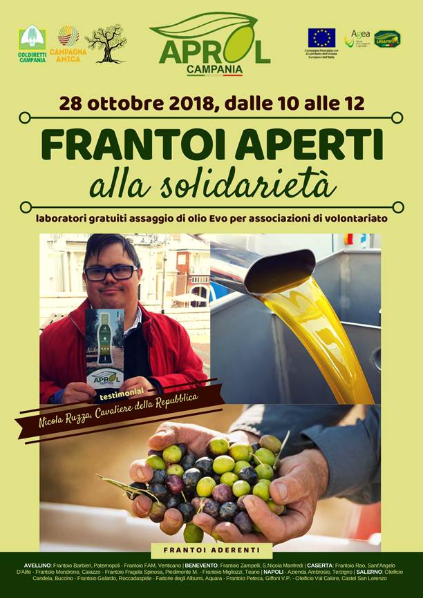 Avellino – Alla scoperta dell’olio extravergine d’oliva campano con un percorso gratuito, riservato ai diversamente abili, su tutto il territorio regionale. È il tema dell’iniziativa “Frantoi Aperti alla Solidarietà”, promossa dall’organizzazione degli olivicoltori Aprol Campania, in collaborazione con la federazione regionale di Coldiretti, che si terrà domani domenica 28 ottobre 2018 dalle 10 alle 12. Nelle cinque province della regione sono coinvolti 12 frantoi, dove i tecnici di Aprol faranno da tutor dell’olio per gli ospiti, guidandoli all’interno degli impianti produttivi e dove possibile anche negli uliveti. Alla fine del percorso i visitatori potranno seguire un laboratorio di degustazione dell’olio Evo per imparare a riconoscerne i sentori e le caratteristiche. In diverse aree della regione si usa ancora definire il frantoio come “trappeto”, una parola derivata dal latino “trapetum” e dal greco antico “trapeton”.