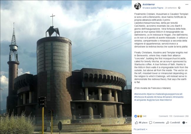 Dopo essere finito nel mirino per quello che la pagina aveva definito ‘Padre Pio Robot’, ecco il nuovo giudizio sulla chiesa Moscati, che fu inaugurata il 10 dicembre 2005 dopo 12 anni tormentati di lavori durante i quali ricevette anche la visita del Gabibbo di ‘Striscia la Notizia’, che giunse in zona dopo le segnalazioni dei residenti preoccupati per le difficoltà riscontrate nel raggiungere il luogo di culto a causa di una viabilità alquanto pericolosa. Per Architerror la chiesa del quartiere Capodimonte è qualcosa che accomuna più religioni: “Finalmente Cristiani, Musulmani e Cavalieri Templari si sono uniti a Benevento, dove hanno fortificato la propria alleanza edificando il primo castello/chiesa/moschea, detta per brevitá CaChieMo, acronimo inventato da Lino Banfi il giorno dell’inaugurazione – si legge ironicamente sulla pagina – Vera fortezza della fede, grazie ai muri spessi 666cm é inespugnabile sia dall’esterno, a chi indossa le Hogan, che dall’interno, a chi non si è pentito di averle indossate. Il vettore a sinistra, campamissile o minarazzo a seconda della religione di appartenenza, servirà invece a dimostrare la rediviva teoria che vuole la terra piatta”.