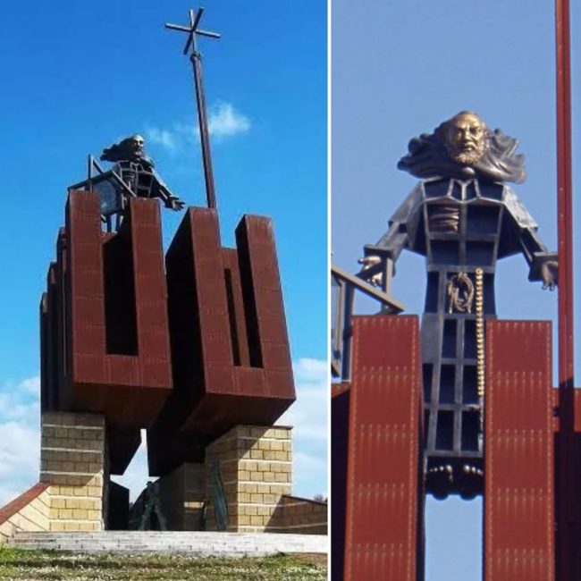 In precedenza era stata la statua di Padre Pio ad attirare commenti ispirati ai cartoni animati del Sol Levante: “Disegnato dal grande Go Nagai e ispirato al santo di Pietrelcina, questo nuovo supereroe robot con base a Benevento combatte gli Agnostici provenienti dal pianeta Ateo-X a bordo della Cadrega, il carro spaziale in corten normalmente mimetizzato da architettura sovietica. Le sue armi sono le “stimmate perforanti”, “l’omelia narcolettica”, il “rosario infinito”, il “confessionale imprigionante”, ma soprattutto la conversione finale, con la quale neutralizza i nemici per sempre”.