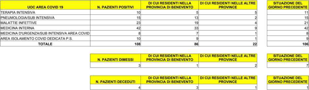 Benevento – Sono 4 i decessi all’Ospedale “San Pio” di Benevento nelle ultime 24 ore, questo il dato più allarmante del bollettino informativo del 18 novembre. Dei quattro decessi, tre sono sanniti, mentre un’altra persona residente in altra provincia. Il numero dei pazienti ricoverati per Covid-19 nel nosocomio sannita risultano essere 108, le persone dimesse 3.