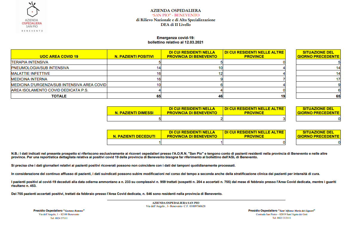 Benevento – Un nuovo decesso e cinque pazienti dimessi. Questa la situazione riportata dal bollettino diramato dall’azienda ospedaliera San Pio di Benevento, che comunica anche il quadro degli attualmente ricoverati. Sono 65 i pazienti che occupano l’area Covid, numero invariato rispetto al dato di ieri. Quarantasei di questi sono cittadini della provincia di Benevento, cinque dei quali in terapia intensiva. Di seguito il report completo.