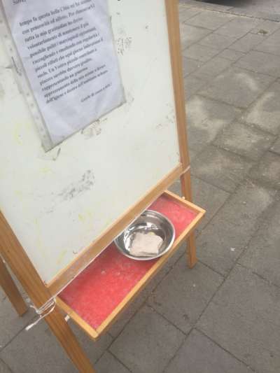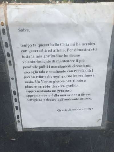 “Salve, – si legge – tempo fa questa bella Città mi ha accolto con generosità e affetto. Per dimostrarVi tutta la mia gratitudine ho deciso volontariamente di mantenere il più possibile puliti i marciapiedi circostanti, raccogliendo e smaltendo con regolarità i piccoli rifiuti che ogni giorno imbrattano il suolo. Un vostro piccolo contributo a piacere sarebbe davvero gradito, rappresentando un generoso apprezzamento della mia azione a favore dell’igiene e decoro dell’ambiente urbano“.