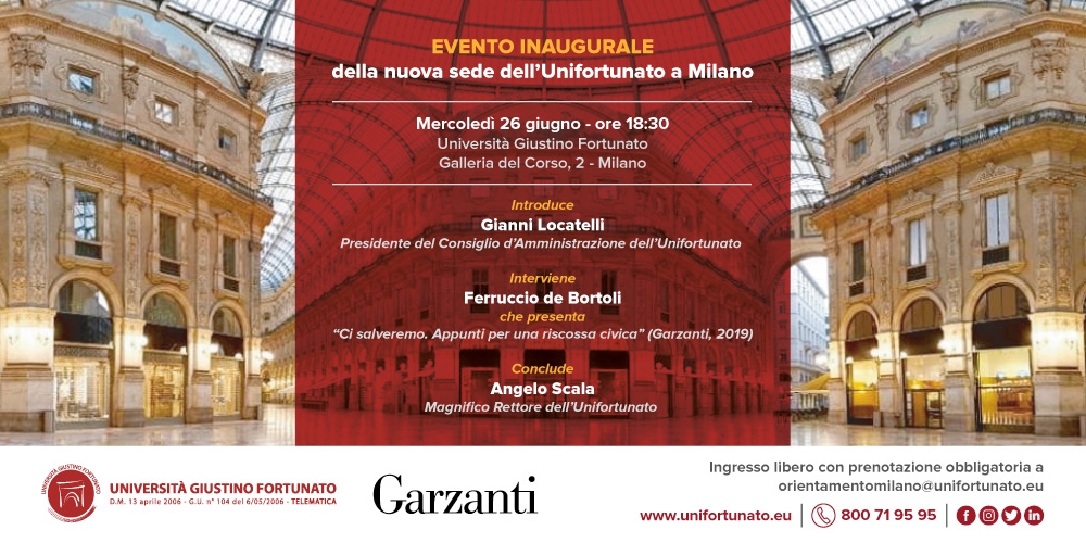 Inaugurando la nuova sede e scegliendola nel cuore di Milano, l’Università Giustino Fortunato si apre anche al territorio lombardo in generale e propone un luogo dove ospitare iniziative culturali e di orientamento in collaborazione con Enti, Istituzioni e partner locali, come già accade a Benevento. Con questo scopo, per la sua apertura ufficiale ospiterà un “testimone del tempo” quale è Ferruccio de Bortoli con il suo ultimo libro “Ci salveremo – Appunti per una riscossa civica” edito da Garzanti.