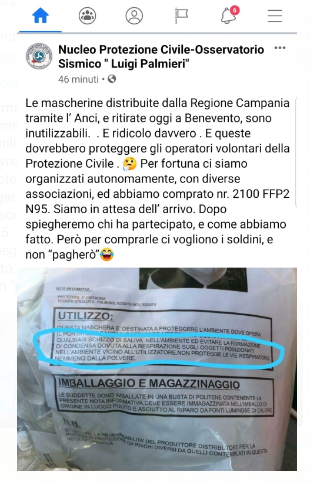 Attraverso il proprio profilo facebook il nucleo di Protezione Civile ha definito “ridicola” la consegna di questi dispotivi. Le mascherine non risulterebbero adatte a fornire un’adeguata protezione. A fronte di ciò, si spiega sempre nel post del Nucleo, “ci siamo organizzati autonomamente ed abbiamo acquistato 2100 FFP2 N95”.