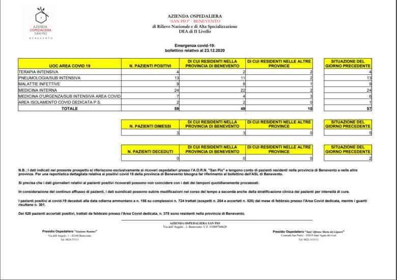 Benevento – Cresce, seppur lievemente, il numero dei ricoveri per Covid – 19 all‘Ospedale San Pio di Benevento. Nella giornata di oggi non si registrano persone decedute.