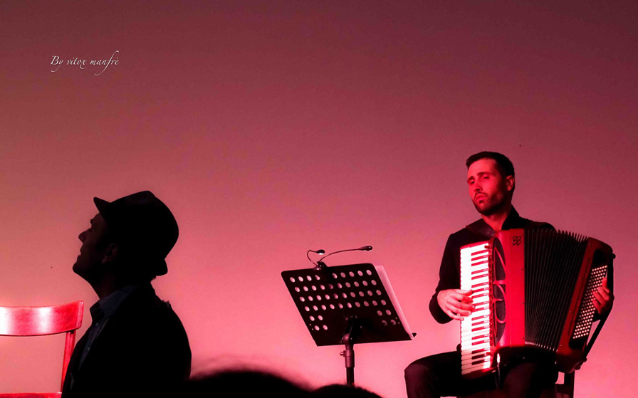 In scena l’attore e il fisarmonicista si alternano in una commistione sonora, linguistica e fisica, accompagnano lo spettatore in un percorso che odora di cenere, di pietra, di terra, di sale e di fatica, dove le note del musicista e la voce dell’attore creano momenti comici, drammatici, malinconici e surreali. Fosco è lo scemo del villaggio con gli occhi arrossati che non vedevano, e, tra ricordi e canzoni, fa pensare all’andare della vita, si ritorna a quelle realtà antiche di paesi del sud, di pietre arse dal sole, di odore di sale, di sale che spacca la pelle e brucia le ferite. In questo contesto si muove “Fosco ‘u salinaro”, che ha come alter ego solo Peppino, ‘u ciucciariello”, e il suo mestiere duro e faticoso, tutto per pochi ‘piccioli’.