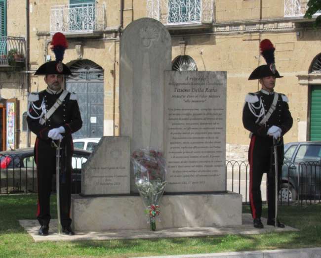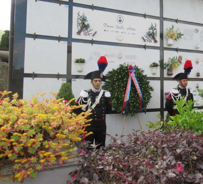 Alla fine della cerimonia religiosa, il piccolo orfano Alfonso ha rivolto una dedica al proprio padre affinchè vegli su di lui, la mamma ed i nonni. Subito dopo il Generale Stefanizzi ha sottolineato lo spirito di fratellanza esistente fra tutti coloro che indossano la divisa dell’Arma che sarà sempre a vicino a chi, come la medaglia d’oro, ha sacrificato la propria vita a presidio della legalità. Ha poi concluso citando una lettera scritta da alcuni alunni di seconda elementare della Scuola Pascoli di Macerata Campania (CE) che hanno rimarcato la figura sociale del Carabiniere in generale e quella di Tiziano Della Ratta in particolare.