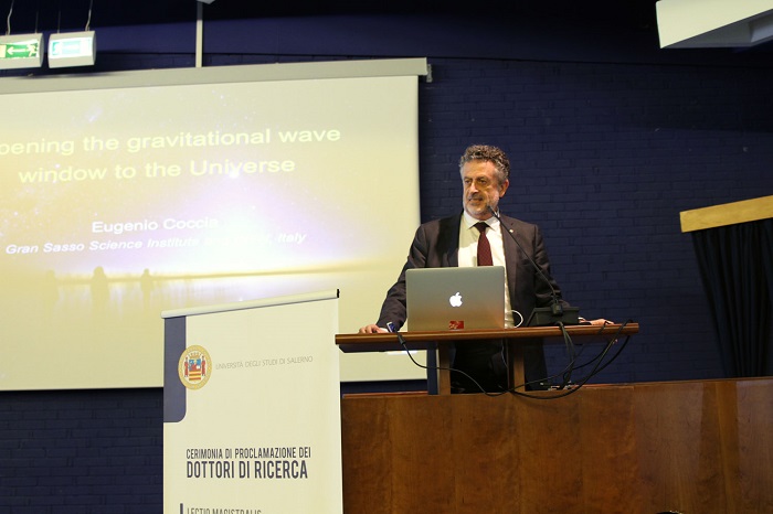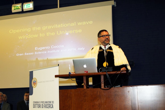 Ai nuovi dottori di ricerca dell’Università di Salerno è stata dedicata la Lectio magistralis tenuta dal professore Eugenio Coccia, Rettore del ‘Gran Sasso Science Institute’ de L’Aquila. Un’interessante Lectio di fisica che ha approfondito diverse tematiche, dal modello geocentrico attribuito a Tolomeo, passando per la rivoluzione copernicana sino ad arrivare alle teorie contemporanee sull’universo, offrendo alla platea dell’Aula Magna di Ateneo un affresco prezioso e affascinante dell’attuale cosmo.