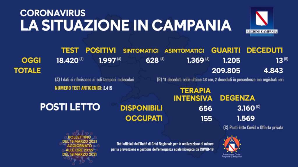 Napoli – Sono 1.997 i nuovi positivi al covid in Campania, dato riferito – precisa l’unità di crisi – ai soli tamponi molecolari, che sono stati 18.420 per un tasso di incidenza pari al 10,84%. Nel bollettino, aggiornato alla mezzanotte scorsa, anche tredici nuove vittime, di cui 11 registrate nelle ultime 48 ore e due avvenute in precedenza. I guariti sono 1.205, i posti letto di terapia intensiva occupati 155 (+2) e quelli di degenza Covid 1.569 (+7)