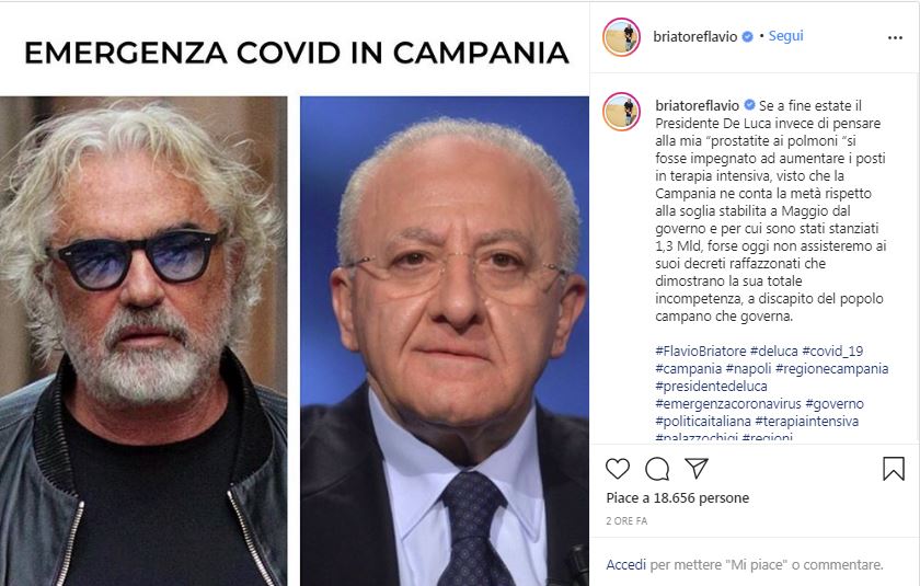 Briatore attacca pesantemente il governatore della Regione Campania Vincenzo De Luca. E lo fa, manco a dirlo, attraverso un post pubblicato sul suo profilo Instagra: