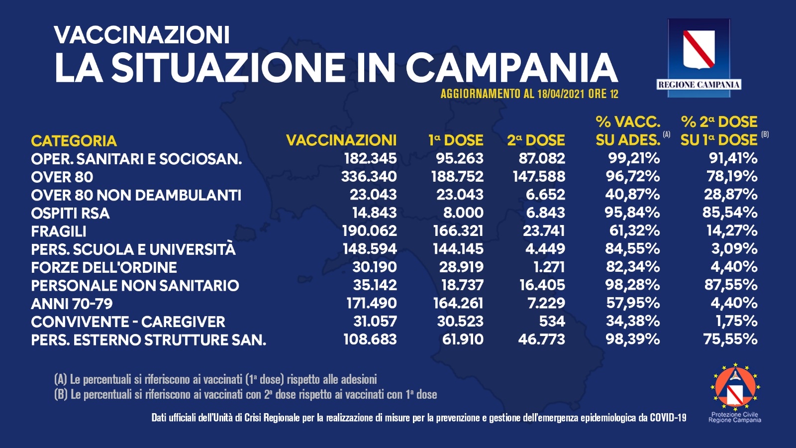 La Regione ha comunicato i dati delle vaccinazioni in Campania aggiornati alle ore 12 del 18 aprile 2021. Complessivamente sono stati vaccinati con la prima dose 929.874 cittadini. Di questi 348.567 hanno ricevuto la seconda dose. Le somministrazioni effettuate sono state, in totale, 1.271.789. La piattaforma per le adesioni è regolarmente aperta per tutte le categorie previste.