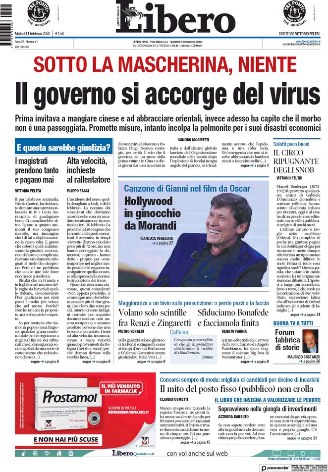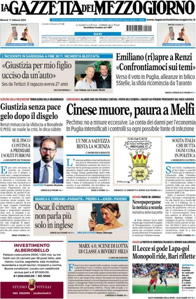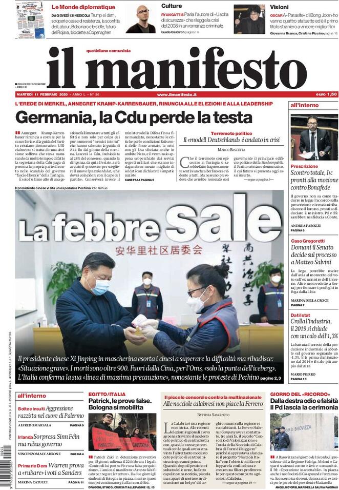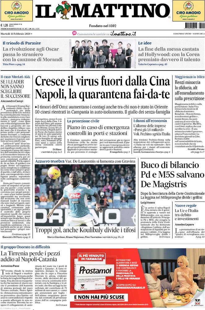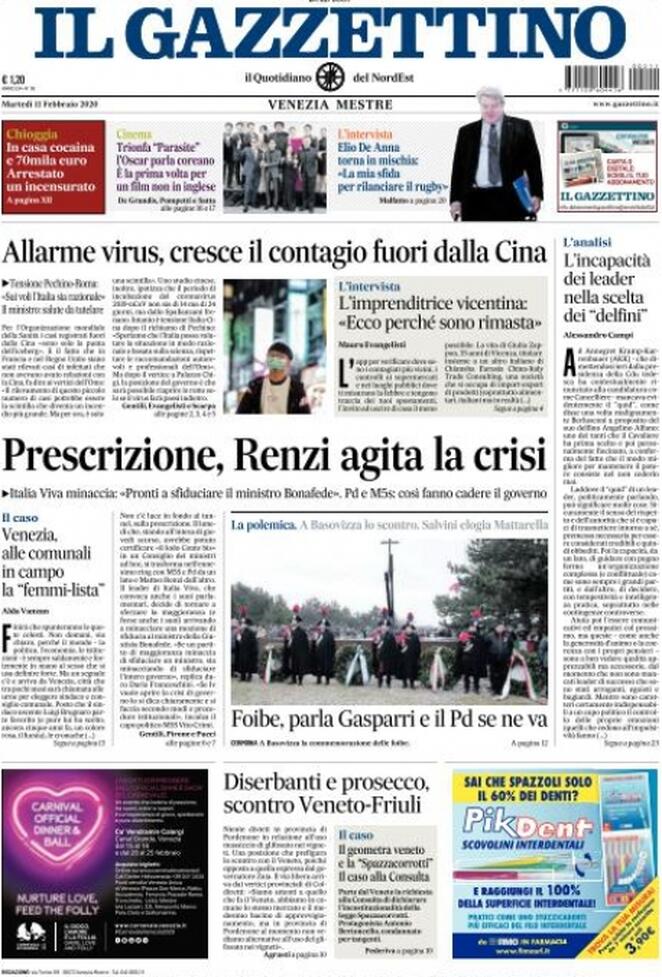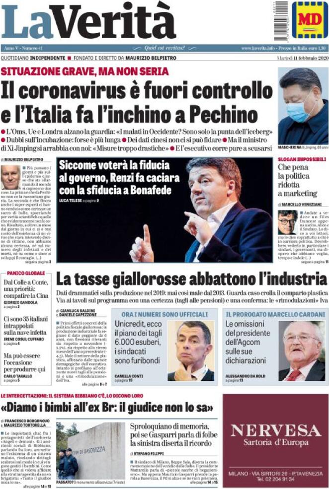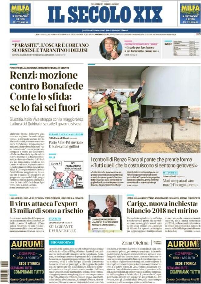 Coronavirus e politica in primo piano sui quotidiani in edicola oggi, martedì 11 febbraio. Sul fronte virus, tengono banco i rapporti Italia-Cina, le prime misure per aiutare le imprese e la paura del contagio. Sul versante politica, invece, è la “sfiducia” di Renzi nei confronti del ministro Bonafede ad agitare la maggioranza giallorossa. Per lo sport, invece, affascina la corsa a tre per lo scudetto.
