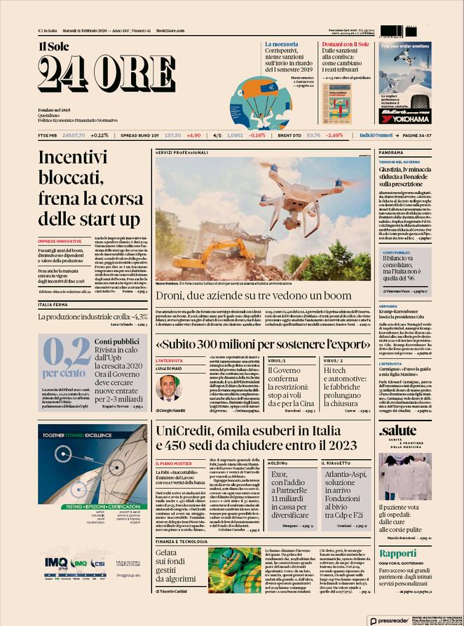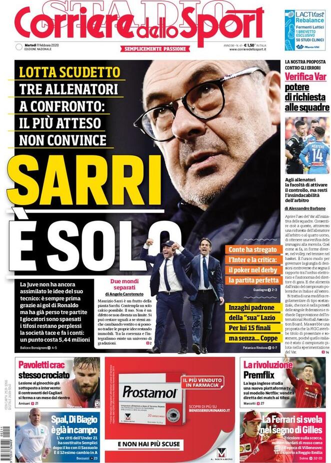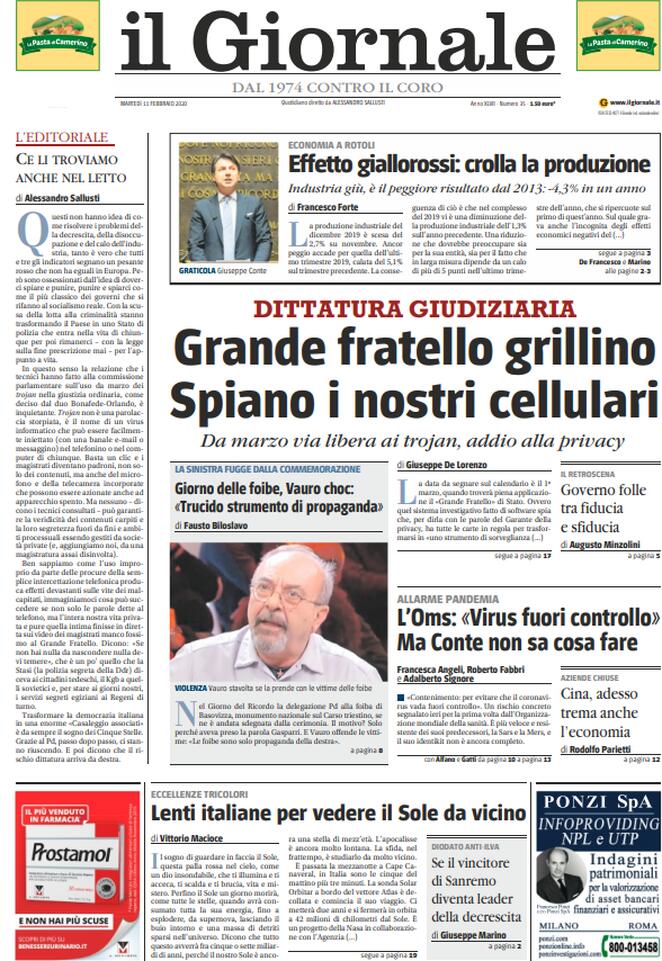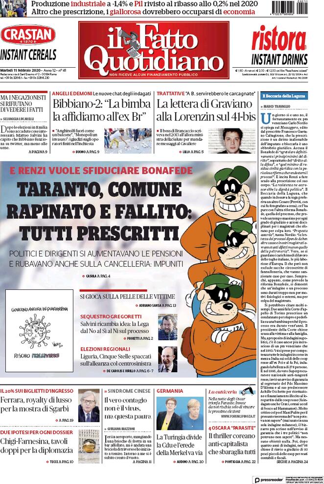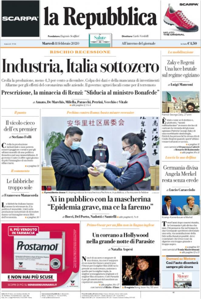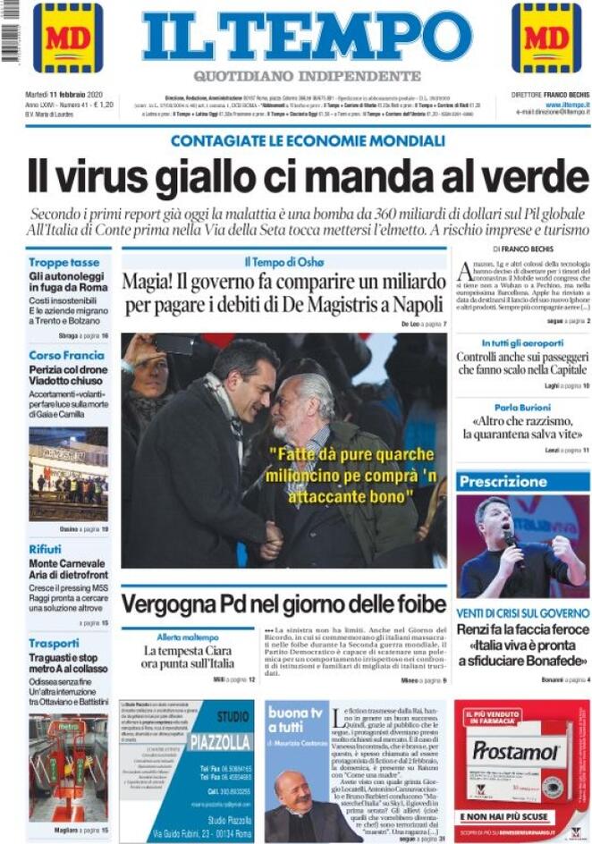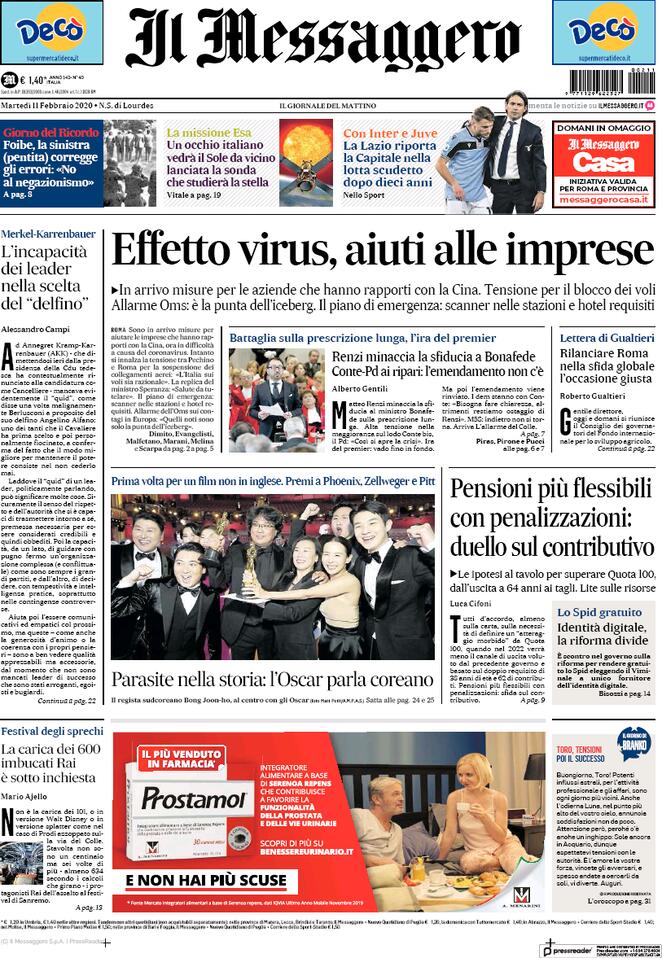 Coronavirus e politica in primo piano sui quotidiani in edicola oggi, martedì 11 febbraio. Sul fronte virus, tengono banco i rapporti Italia-Cina, le prime misure per aiutare le imprese e la paura del contagio. Sul versante politica, invece, è la “sfiducia” di Renzi nei confronti del ministro Bonafede ad agitare la maggioranza giallorossa. Per lo sport, invece, affascina la corsa a tre per lo scudetto.