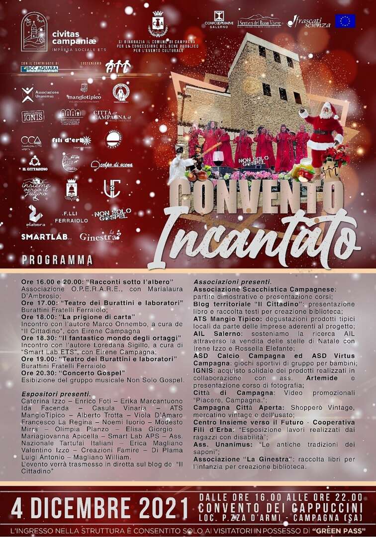 Campagna (Sa) – La cooperativa sociale Civitas Campaniae, presieduta da Christian Plaitano, invita grandi e piccini alla prima edizione del “Convento Incantato”. La manifestazione si svolgerà sabato 4 dicembre dalle ore 16 alle 22 a Campagna presso il Convento dei Cappuccini in Piazza D’Armi.