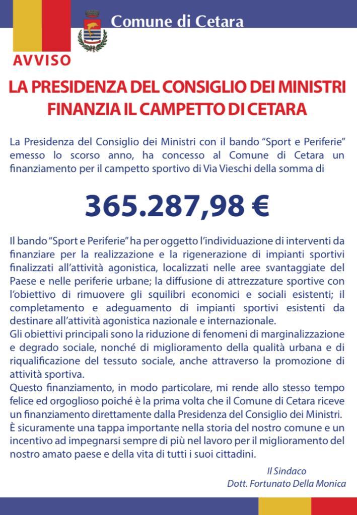 Finanziamento che mi rende felice e orgoglioso: è la prima volta che il Comune di Cetara riceve un finanziamento direttamente dalla Presidenza del Consiglio dei Ministri. Tappa importante nella storia del nostro Comune ed un incentivo a impegnarsi per il miglioramento del nostro paese e della vita di tutti i cittadini”.