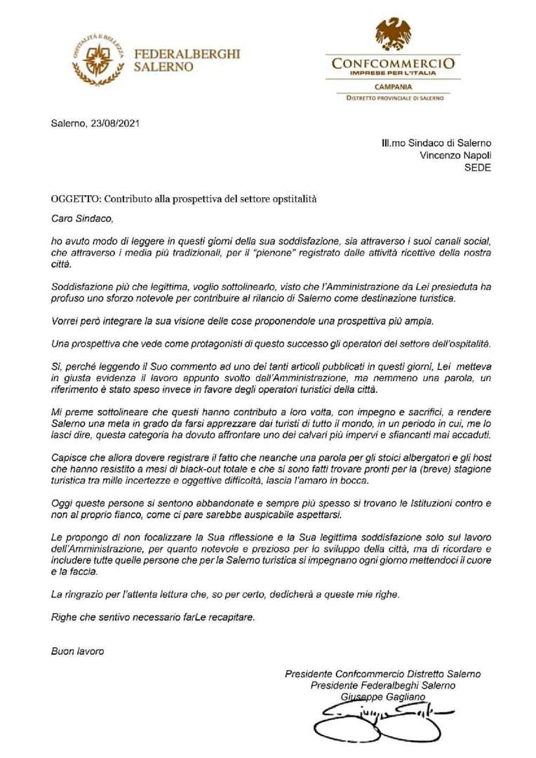 Ripresa turistica a Salerno merito solo del Comune? E degli operatori, no?” È questo il senso della ‘lettera aperta’ inviata al sindaco del Comune di Salerno Vincenzo Napoli, dall’albergatore Giuseppe Gagliano nella sua duplice veste istituzionale di presidente Confcommercio e Federalberghi Salerno.
