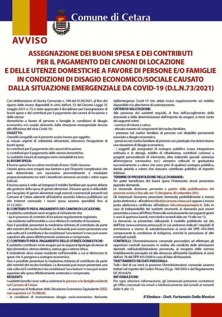 REQUISITI – I suddetti benefici sono volti a sostenere le persone e le famiglie residenti nel Comune di Cetara in possesso di Indicatore della Situazione Economica Equivalente (ISEE) non superiore a € 15.000; in condizioni di momentaneo disagio socio-economico derivante dall’emergenza Covid-19 che abbia inciso negativamente sul reddito disponibile e/o altre forme di sostentamento.