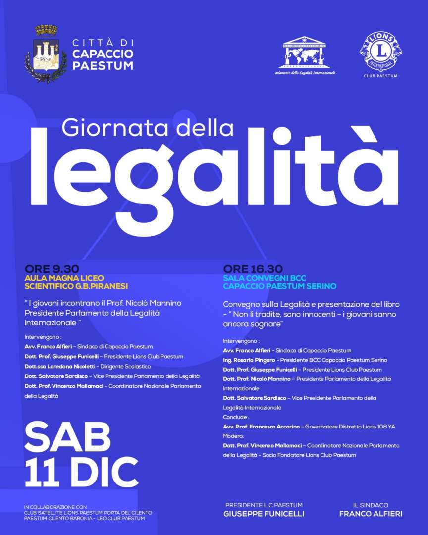 Capaccio Paestum (Sa) – Quello dell’11 dicembre sarà un sabato dedicato alla legalità. Voluto fortemente dal professore Vincenzo Mallamaci, la manifestazione ha trovato pieno appoggio nel Comune di Capaccio Paestum e nel Lions Club Paestum.