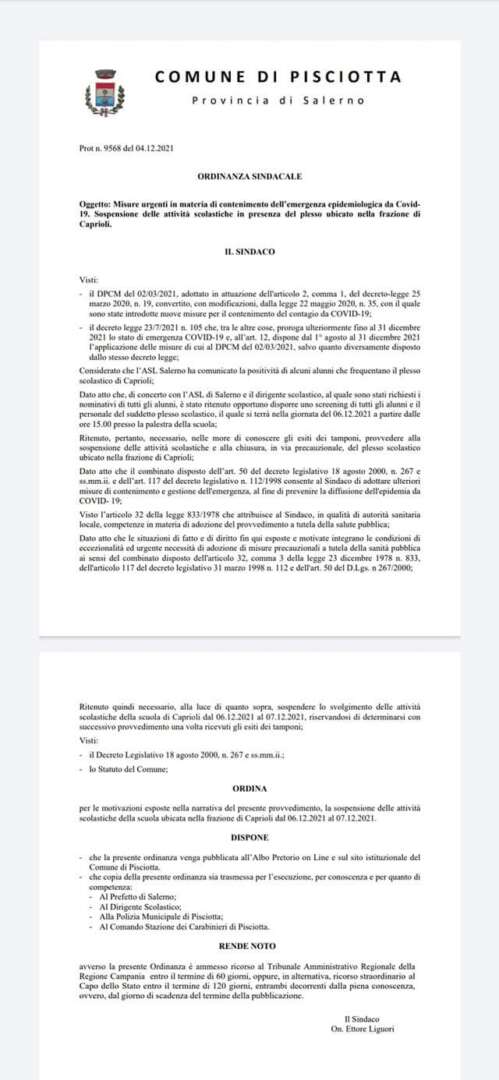 Si legge: “(…) L’Asl di Salerno ha comunicato la positività di alcuni alunni che frequentano il plesso scolastico di Caprioli.