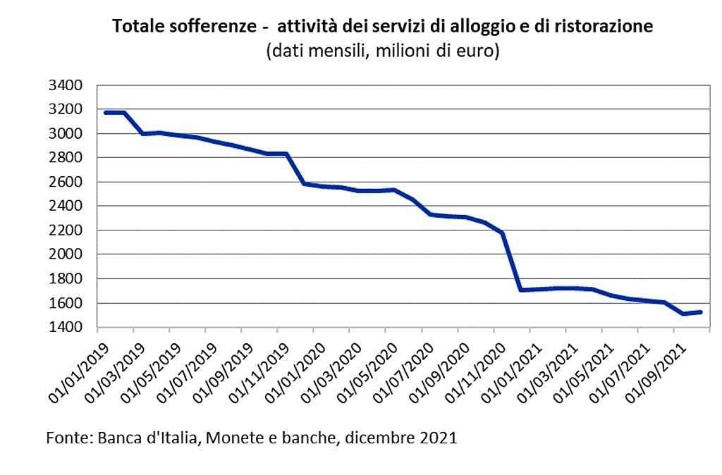 Qualche segnale negativo si comincia ad avvertire: i crediti in sofferenza nel comparto alloggi e ristorazioni sono ancora elevati e in aumento a ottobre rispetto a settembre, per la prima volta da circa un anno: ammontano secondo Banca d’Italia a 1,53 miliardi di euro da 1,51 a settembre, seppure in diminuzione di circa un terzo rispetto a un anno fa (erano 2,3 a ottobre 2020). È un segnale ancora di difficile interpretazione ma potrebbe evidenziare un aumento delle difficoltà delle imprese del comparto turistico, che potrebbe aggravarsi nei prossimi mesi.