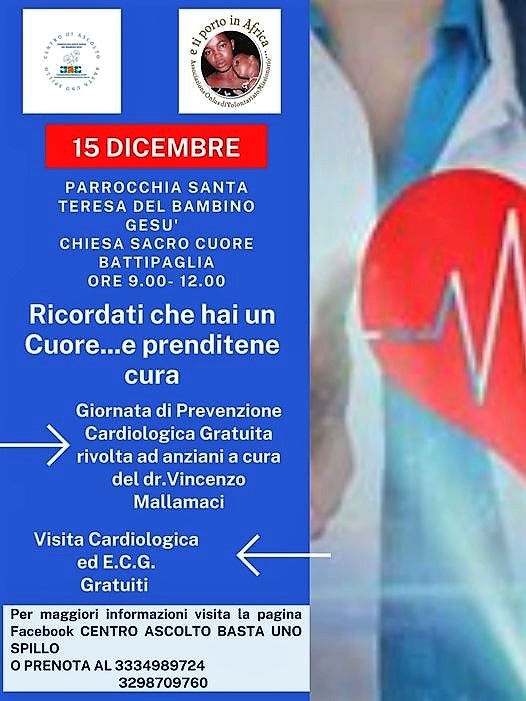 Mercoledì, quindi, la prima giornata di prevenzione cardiologica gratuita rivolta agli anziani, prevede visite presso la parrocchia del Bambino Gesù – Chiesa del Sacro Cuore di Battipaglia, nella fascia oraria 9-12. Nella locandina in basso tutti i riferimenti utili.