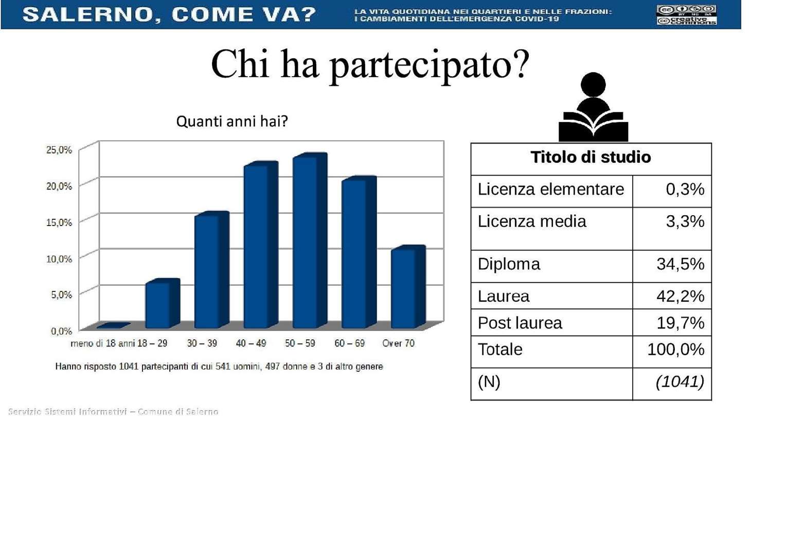 A partecipare sono stati 1.041 salernitani dell’età compresa nel range 18-over 70: uomini 541, donne 497 e 3 di ‘altro genere’. In maggioranza sono laureati (42.2%), seguono i diplomati (34.5%). Vedi immagine in basso.