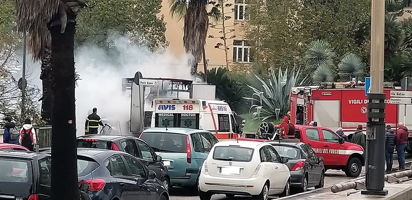 Salerno – Poco dopo le ore 13.30 un furgone si è incendiato proprio nella curva della rotatoria del Parco Pinocchio, quella che da Ponte Rouen immette il traffico veicolare su via Eugenio Caterina e su via Prudente.