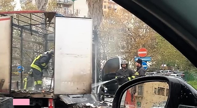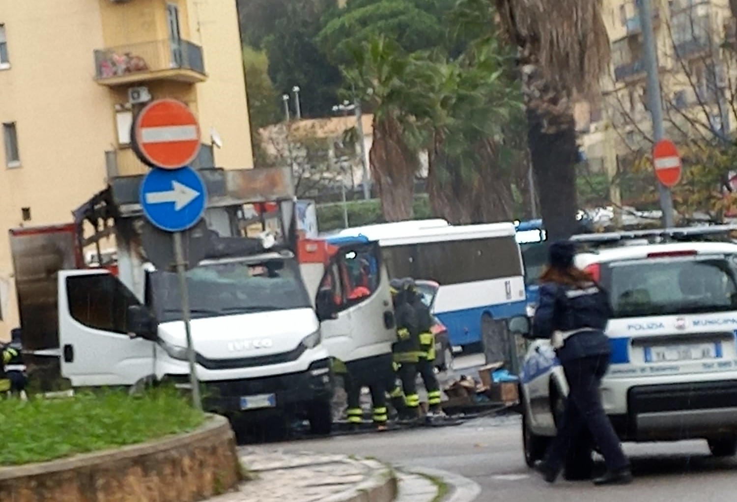 Salerno – Poco dopo le ore 13.30 un furgone si è incendiato proprio nella curva della rotatoria del Parco Pinocchio, quella che da Ponte Rouen immette il traffico veicolare su via Eugenio Caterina e su via Prudente.