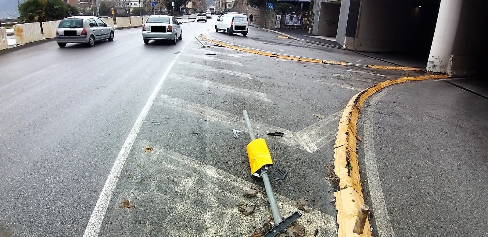 Salerno – Sinistro stradale: è accaduto e, in verità, non sorprende nessuno. Un’auto proveniente da Torrione, probabilmente nottetempo, ha abbattuto la segnaletica verticale posta sulla carreggiata all’entrata/uscita del sottopasso della Lungoirno, nei pressi del Grand Hotel Salerno.