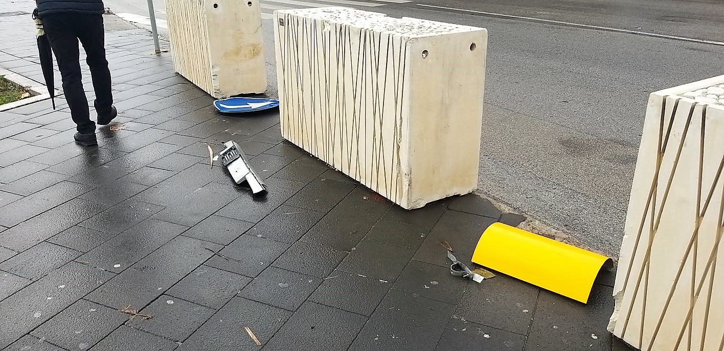 I residui della segnaletica, ma anche del paraurti dell’auto, erano sulla strada e sul marciapiede. L’auspicio è che, quanto meno, le persone a bordo non abbiano riportato traumi.