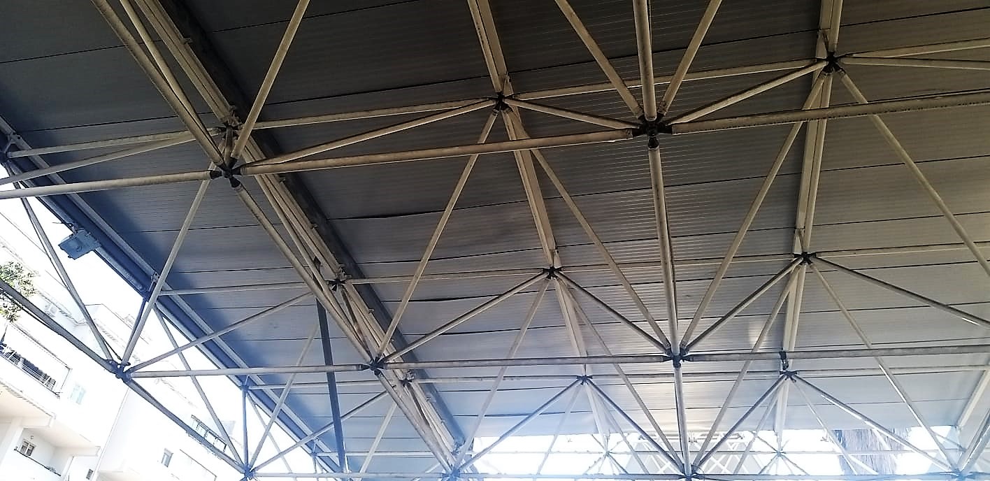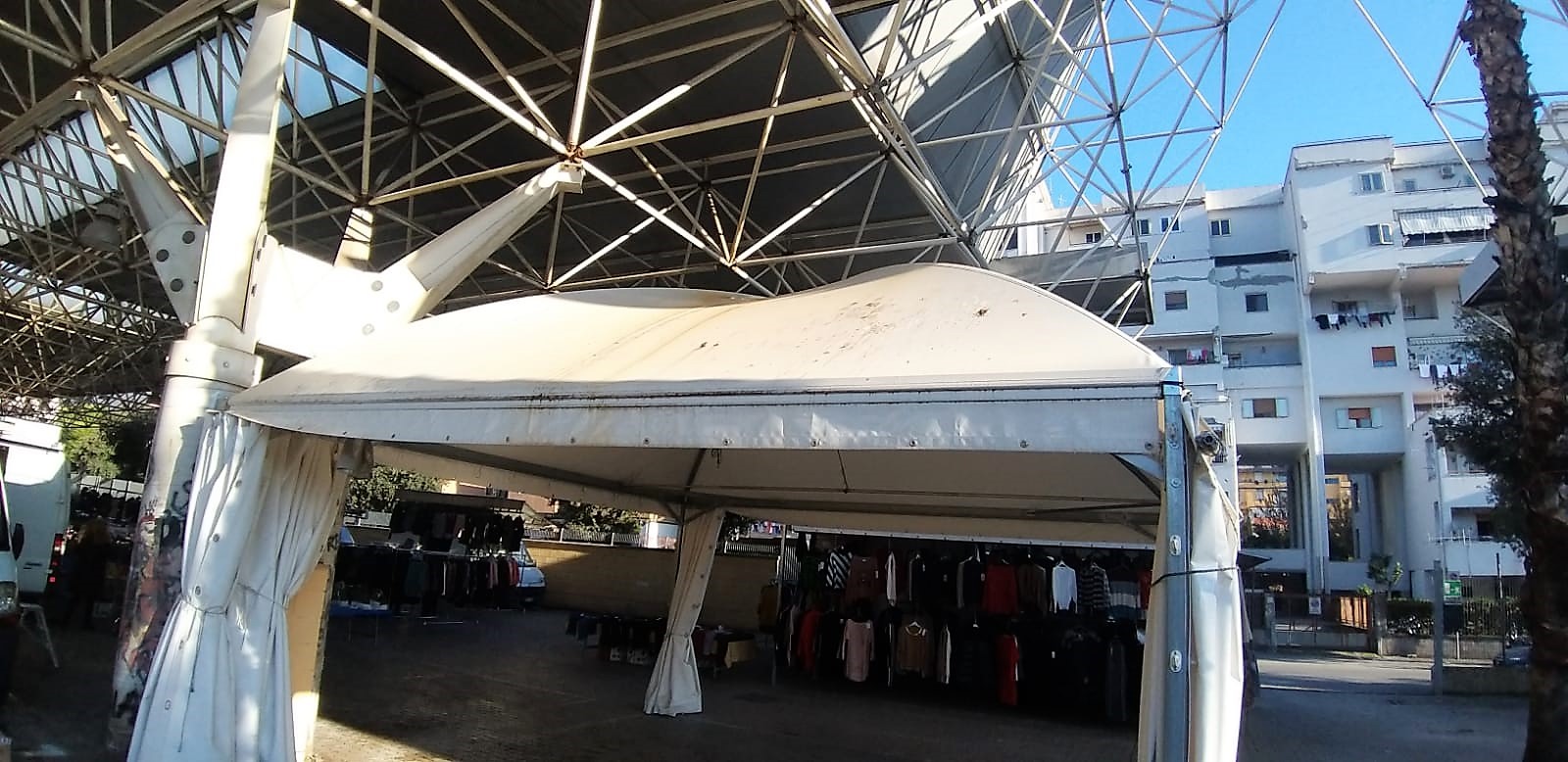 Salerno – Un grosso buco nel plexiglass e molti i pannelli visibilmente ammalorati nella copertura del grande mercato di via De Crescenzo, a Pastena alta. Situazione che crea potenziale pericolo e evidente disagio. Concetti ben spiegati da Dino Sessa, sindacalista dell’Anva Confesercenti: “Circa cinque mesi fa qui vennero i Vigili del Fuoco per un sopralluogo. Ricordo che, saliti con le scale fino all’altezza della parte infradiciata della copertura, per sicurezza non vi misero piede. L’area sottostante, quindi, fu immediatamente circoscritta perché inagibile. Effettivamente ognuno di quei pannelli potrebbe staccarsi da un momento all’altro. A stretto giro arrivarono i tecnici del Comune (l’area mercatale è di competenza municipale, ndr). Fummo rassicurati: in 10-15 giorni il Municipio avrebbe provveduto gli interventi di manutenzione. Di buon grado gli operatori liberarono i sette stalli sottostanti, fiduciosi di poterli rioccupare in breve tempo ed in tutta sicurezza. Da allora qui, però, non è più venuto nessuno. La situazione peggiora di giorno in giorno”.