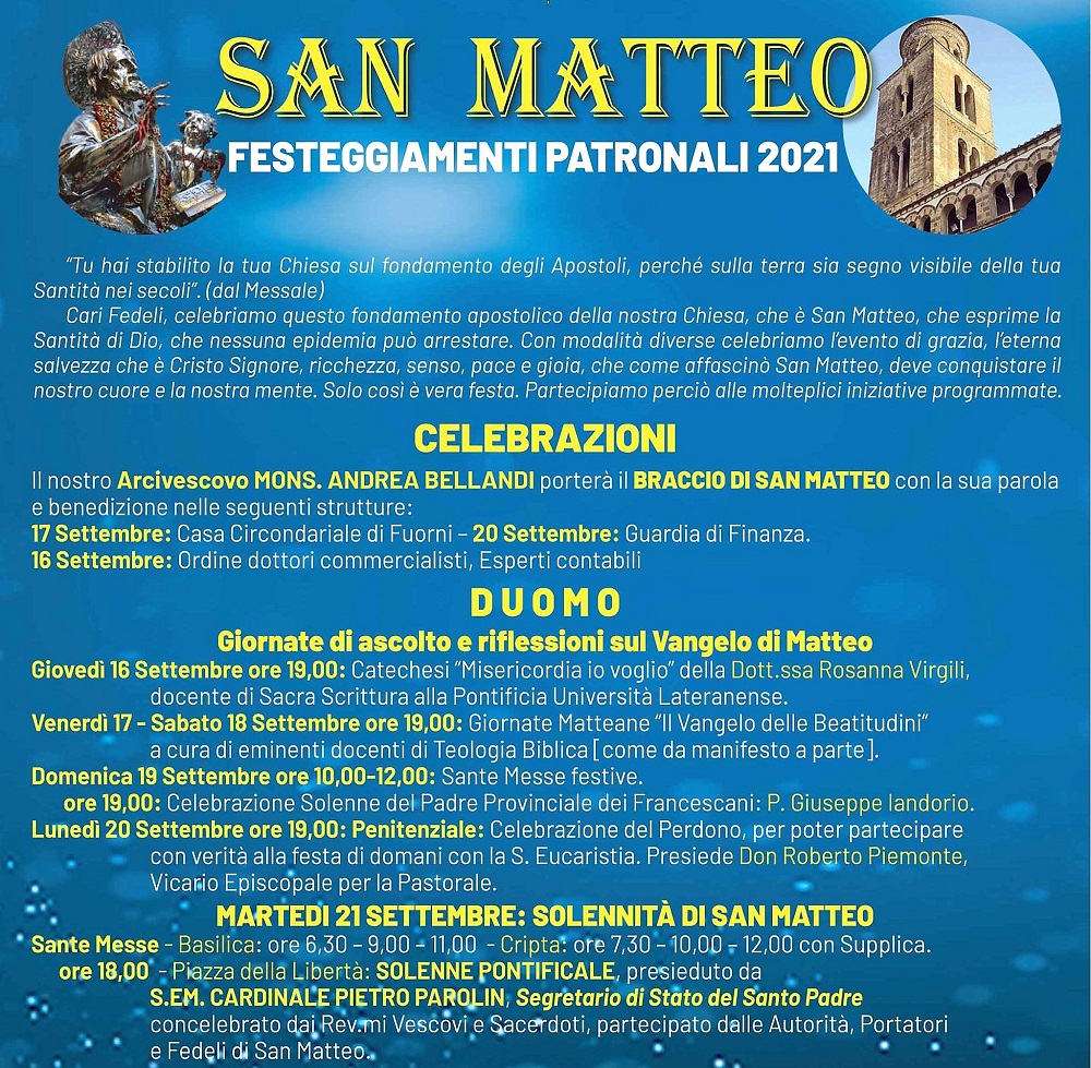 L’Arcidiocesi di Salerno-Campagna-Acerno rende noto che “il nostro Arcivescovo monsignor Andrea Bellandi porterà il ‘braccio di San Matteo’ con la sua parola e benedizione presso l’Ordine dottori commercialisti (16 settembre); casa circondariale di Fuorni (17 settembre); Guardia di Finanza (20 settembre)”.