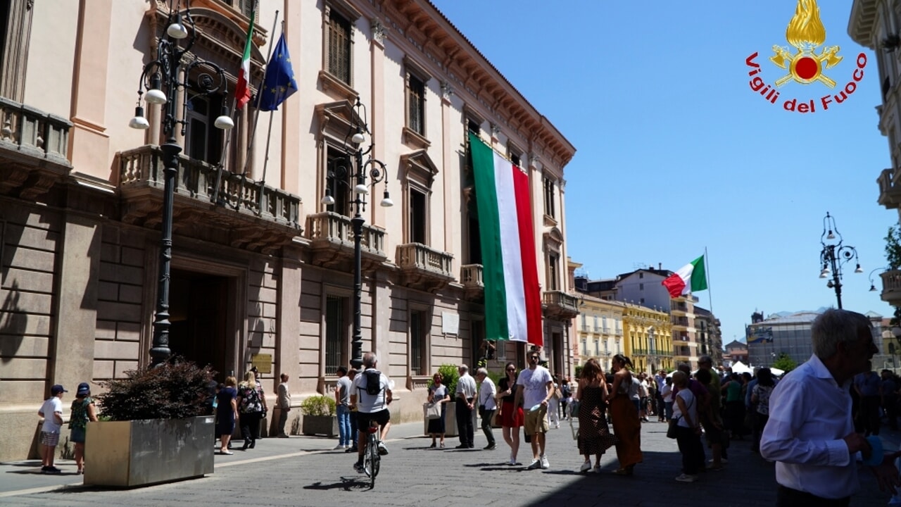 Quindi lo srotolamento del grande tricolore sulla facciata del Palazzo di Governo ad opera dei Vigili del Fuoco e dai militari del Soccorso Alpino Guardia di Finanza. L’evento proseguirà all’interno del Salone degli Specchi della Prefettura con la consegna, alle ore 11.00, delle onorificenze dell’Ordine “Al Merito della Repubblica Italiana”. Lungo Corso Vittorio Emanuele verrà, altresì, allestita una Mostra statica a cura dell’Esercito, delle Forze dell’Ordine e dei Vigili del Fuoco.