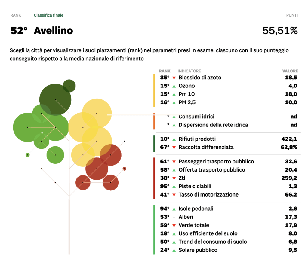 La trentaduesima edizione del rapporto “Ecosistema Urbano” di Legambiente, redatto in collaborazione con Ambiente Italia e Il Sole 24 Ore, conferma un quadro chiaro: il Sud continua a inseguire, ma Avellino fa eccezione. Il capoluogo irpino sale al 52° posto nella classifica nazionale, con un punteggio complessivo del 55,51%, guadagnando 14 posizioni rispetto alla precedente edizione. Un risultato che la porta a essere la prima città della Campania e una delle poche realtà meridionali capaci di migliorare la propria performance ambientale.
