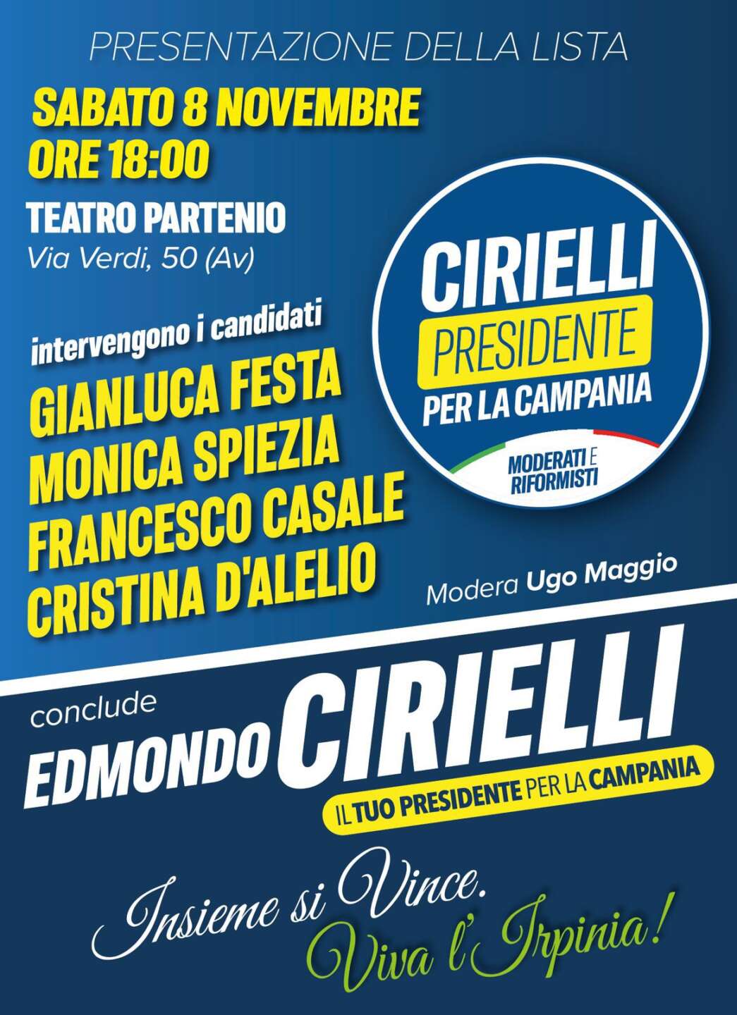Sabato 8 novembre, alle ore 18:00, presso il Cinema Partenio di Avellino, si terrà la presentazione ufficiale della lista “Moderati e Riformisti con Cirielli Presidente”, alla presenza del candidato alla presidenza della Regione Campania Edmondo Cirielli.