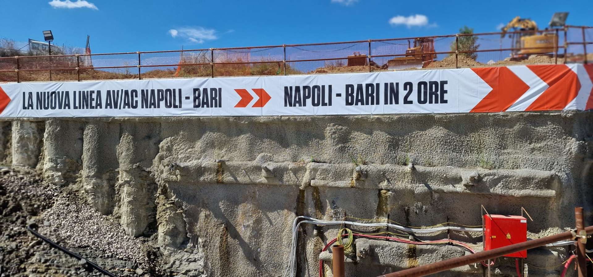 La nuova linea AV/AC Napoli – Bari è parte integrante del Corridoio ferroviario europeo TEN-T Scandinavia – Mediterraneo e rappresenta la prima e più avanzata opera che il Polo Infrastrutture del Gruppo FS sta realizzando per il potenziamento della rete ferroviaria nel Sud Italia. La nuova infrastruttura, di cui Rete Ferroviaria Italiana è committente e Italferr ha curato la progettazione preliminare e definiva, ha un investimento complessivo di 5,8 miliardi di euro, finanziati anche con i fondi del PNRR. Il suo completamento, entro il 2027, velocizzerà il collegamento diretto trasversale tra il Tirreno e l’Adriatico, migliorando le connessioni della Puglia e delle province campane più interne con la linea AV/AC Milano – Roma – Napoli.