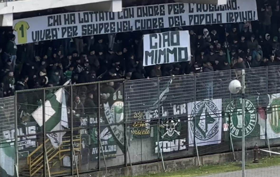 “Chi ha lottato con onore per l’Avellino, vivrà per sempre nel cuore del popolo irpino, Ciao Mimmo”. È questo lo striscione esposto dalla Curva Sud in ricordo di Mimml Cecere, scomparso la scorsa settimana dopo un infarto. Eloquente anche il ricordo di Pasquale Pane che ha “donato” sotto il settore occupato dai tifosi biancoverdi la maglia numero uno di Cecere.
