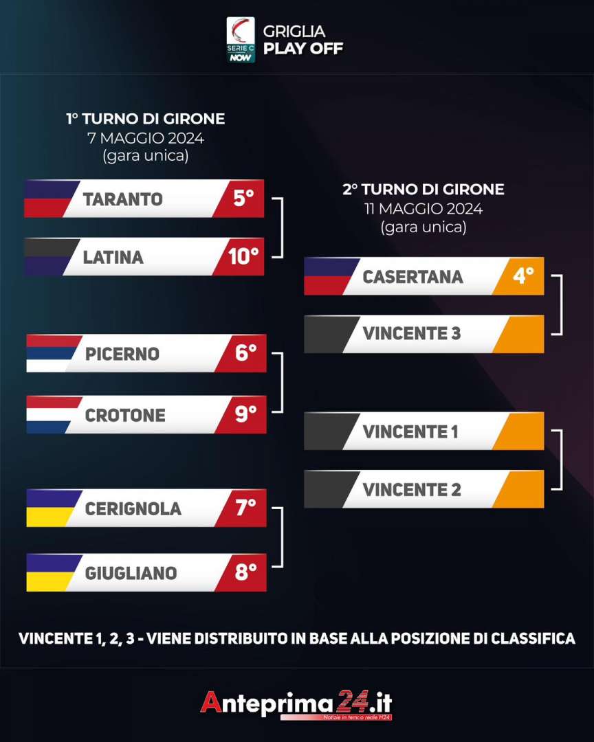 PLAYOFF PRIMO TURNO. Al via il primo turno di girone, quello che coinvolge le squadre che al termine della regular season si sono posizionate dal quinto al decimo posto dei rispettivi gironi. Nel raggruppamento meridionale in campo il Giugliano sarà ospite dell’Audace Cerignola, il Taranto affronterà il Latina e poi Picerno-Crotone. La formazione impegnata in trasferta toccherà vincere nei novanta minuti per cancellare il vantaggio dell’altra squadra. La peggiore tra le qualificate per la classifica del girone affronterà la Casertana.