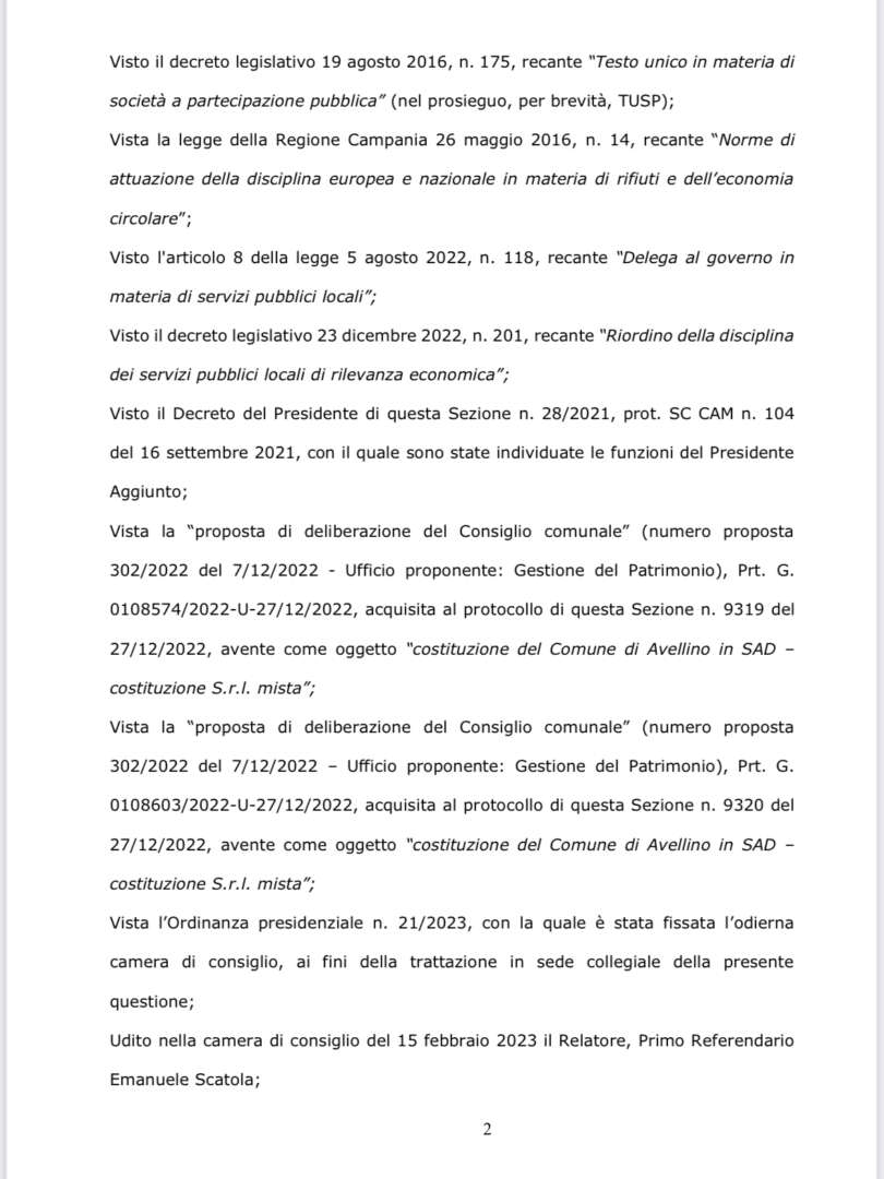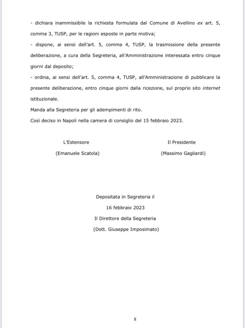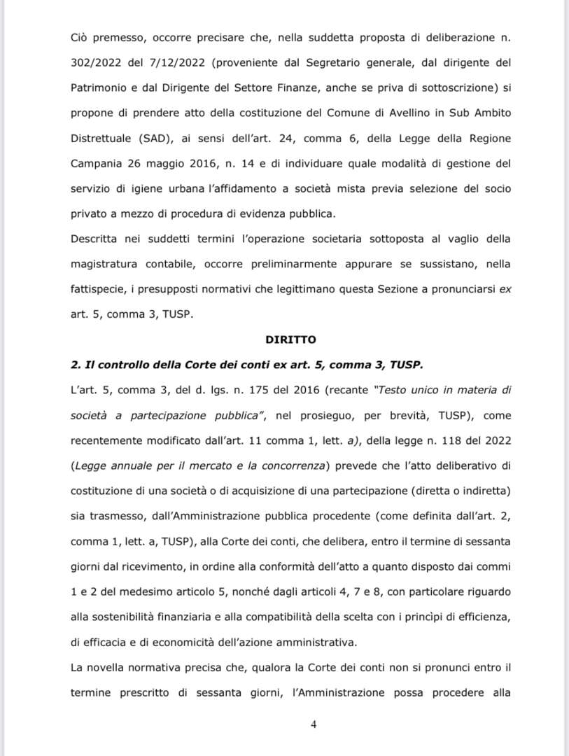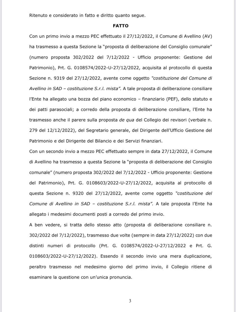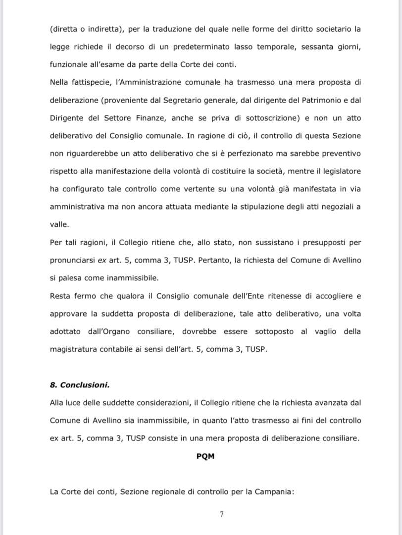 Secondo la Sezione di Controllo della Campania “la richiesta avanzata dal Comune di Avellino è inammissibile, in quanto l’atto trasmesso ai fini del controllo ex art. 5, comma 3, TUSP consiste in una mera proposta di deliberazione consiliare”.