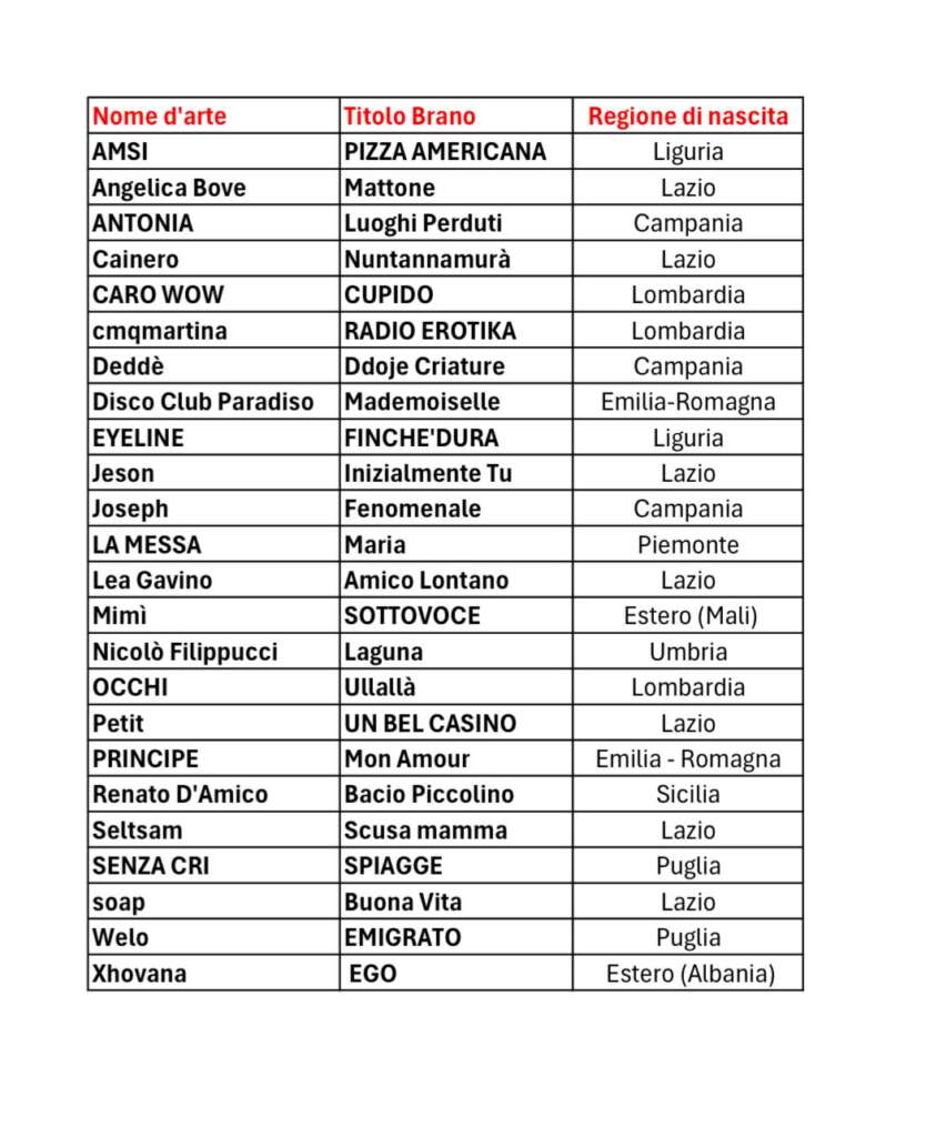 I 24 concorrenti sono: Amsi con il brano Pizza Americana (Liguria), Angelica Bove con Mattone (Lazio), Antonia con Luoghi Perduti (Campania), Cainero con Nuntannamurà (Lazio), Caro Wow con Cupido (Lombardia), cmqmartina con Radio Erotika (Lombardia), Deddè con Ddoje Criature (Campania), Disco Club Paradiso con Mademoiselle (Emilia-Romagna), Eyeline con Finché Dura (Liguria), Jeson con Inizialmente Tu (Lazio), Joseph con Fenomenale (Campania), La Messa con Maria (Piemonte), Lea Gavino con Amico Lontano (Lazio), Mimì con Sottovoce (dal Mali), Nicolò Filippucci con Laguna (Umbria), Occhi con Ullallà (Lombardia), Petit con Un Bel Casino (Lazio), Principe con Mon Amour (Emilia-Romagna), Renato D’Amico con Bacio Piccolino (Sicilia), Seltsam con Scusa Mamma (Lazio), Senza Cri con Spiagge (Puglia), soap con Buona Vita (Lazio), Welo con Emirato (Puglia) e Xhovana con Ego (dall’Albania).