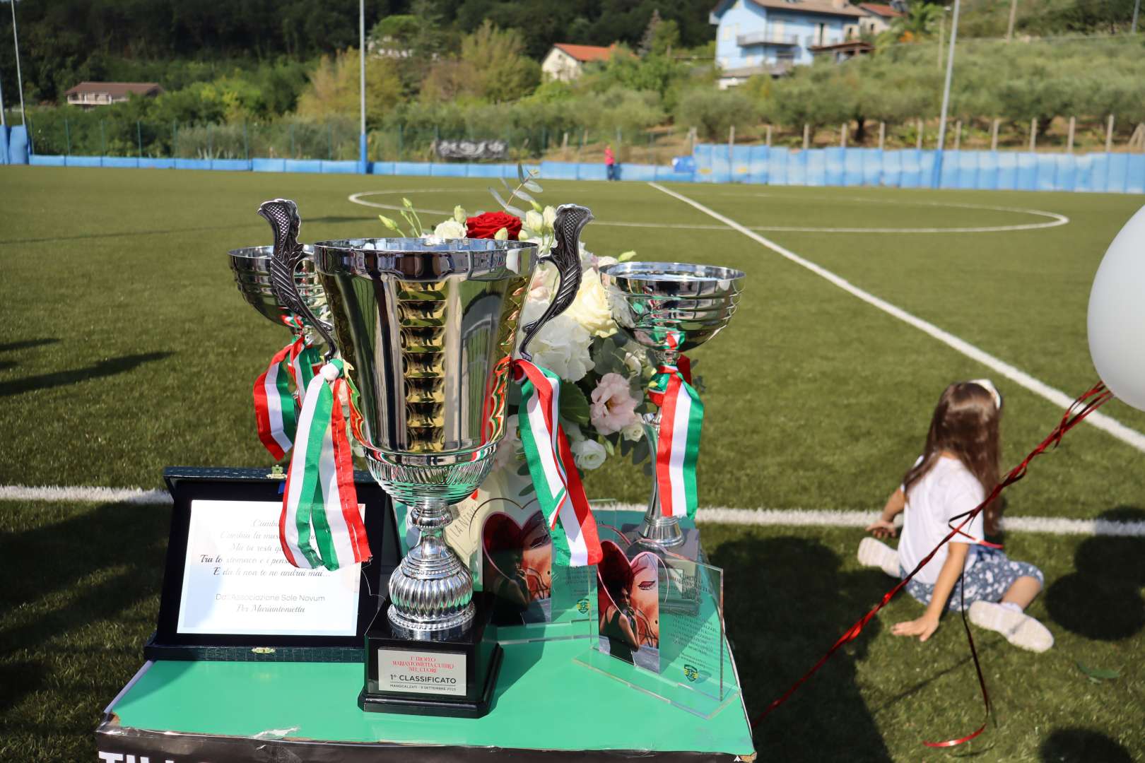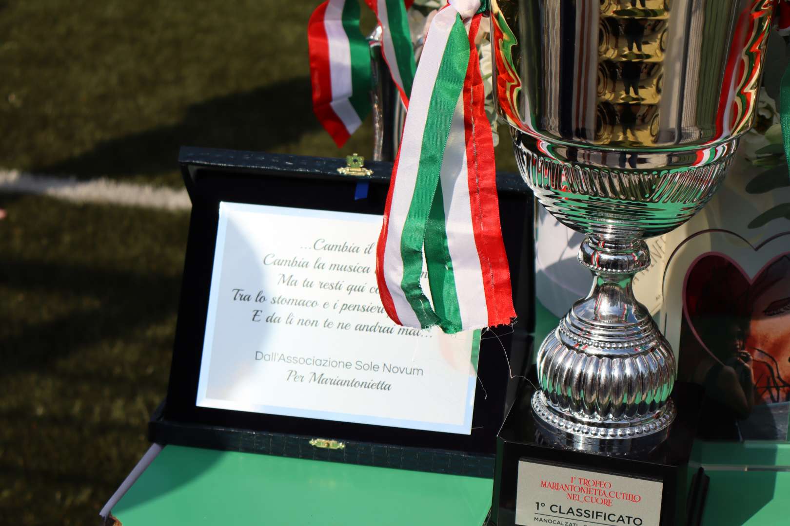 “...Cambia il cielo. Cambia la musica dell’anima, ma tu resti qui con noi, tra lo stomaco e i pensieri più invisibili. E da lì non te ne andrai mai”, la dedica per Mariantonietta sulla targa realizzata dall’Associazione Sole Novum che è posizionata vicino alle tre coppe per la squadra prima classificata, seconda e terza.