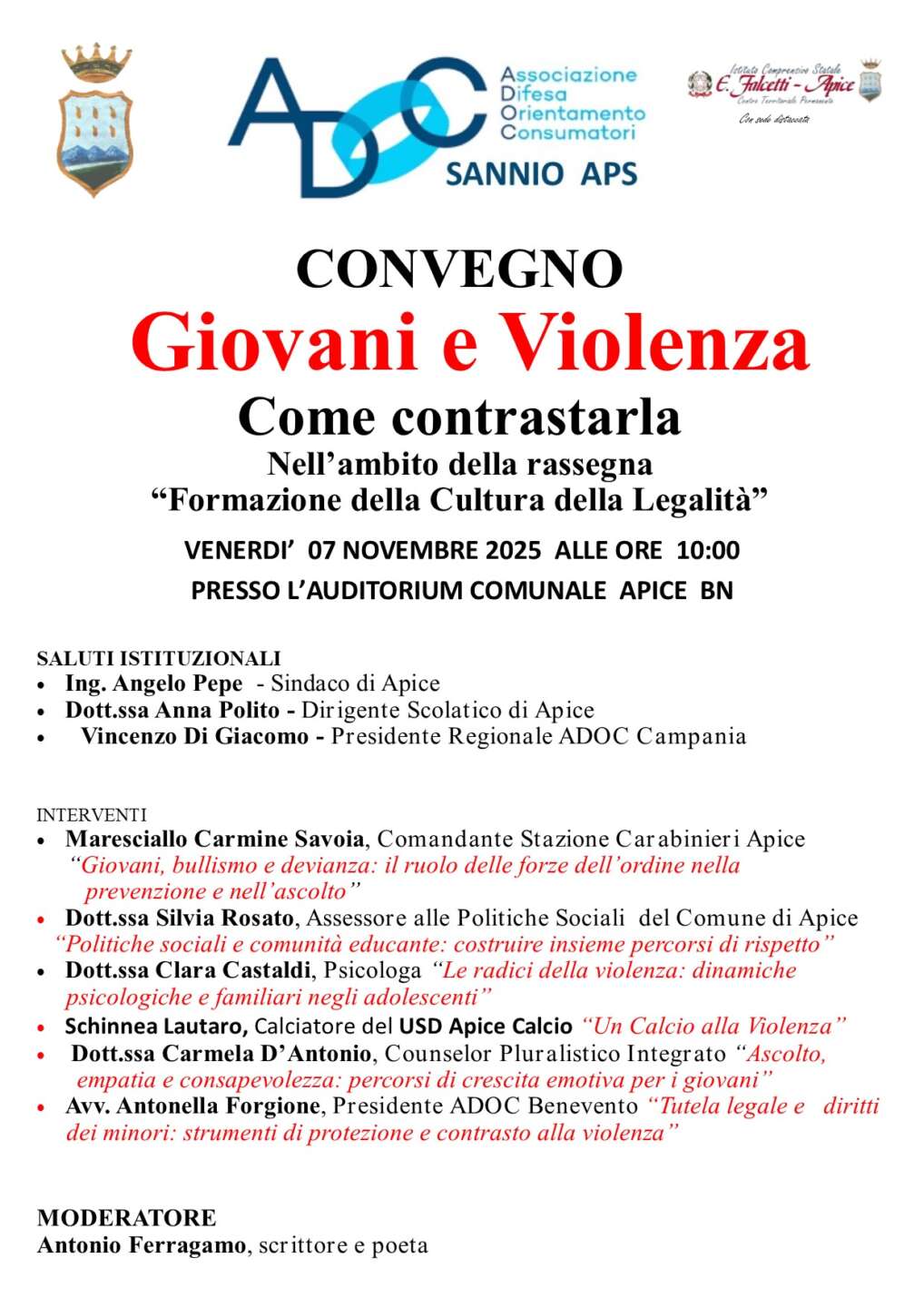 L’incontro vedrà la presenza degli alunni dei plessi scolastici di Apice e Paduli dell’I.C. “Emanuele Falcetti”. L’iniziativa rientra nel percorso educativo e sociale che ADOC Sannio APS porterà avanti sul territorio, con l’obiettivo di promuovere nei giovani una cultura del rispetto, della legalità e della responsabilità condivisa.