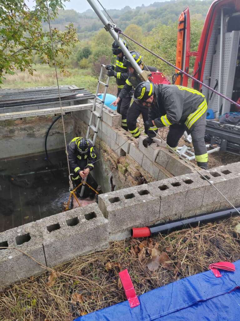 I caschi rossi, nonostante il peso dell’animale, sono riusciti ad imbragare e quindi a riportare grazie ad una gru in superficie la carcassa dell’ungulato per consegnarlo al personale dell’ASL presente sul posto.