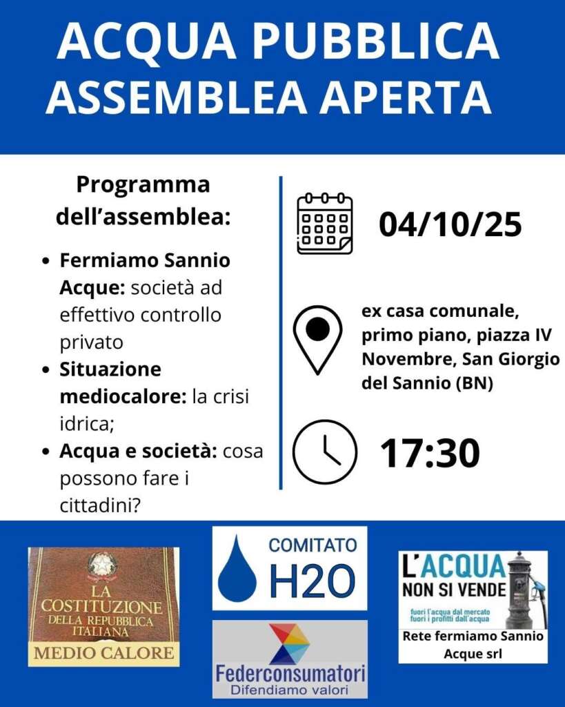 Sabato 4 ottobre 2025, alle ore 17.30, presso l’ex Casa Comunale di San Giorgio del Sannio, cittadini, amministratori e realtà associative si confronteranno sul tema della carenza idrica, sul ruolo del Servizio Idrico Integrato e sulle conseguenze di una gestione non più interamente pubblica.