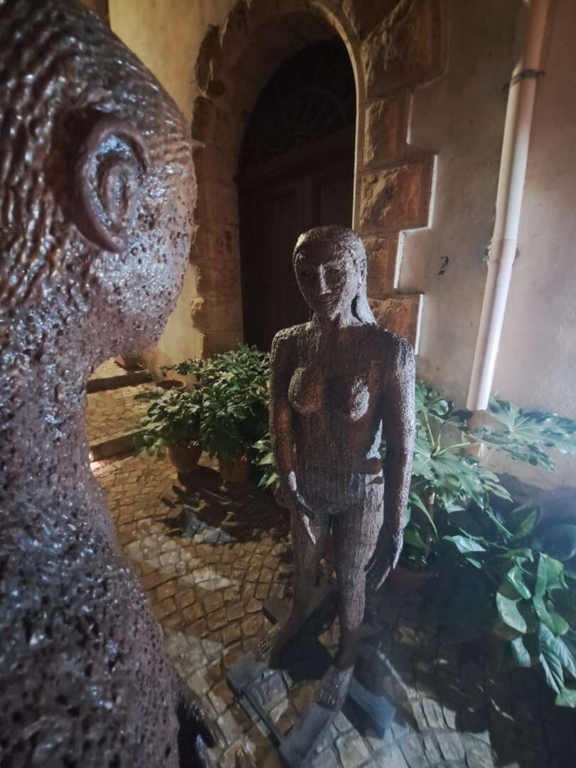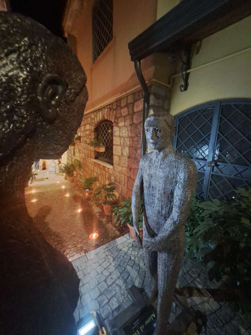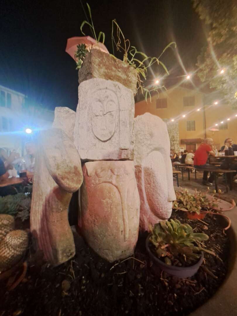Subito sulla sinistra, in imponenti fioriere circondate da composizioni di piante, le sculture dell’artista cautanese Mario Savoia, che porta avanti una lunga tradizione di lavorazione della pietra.