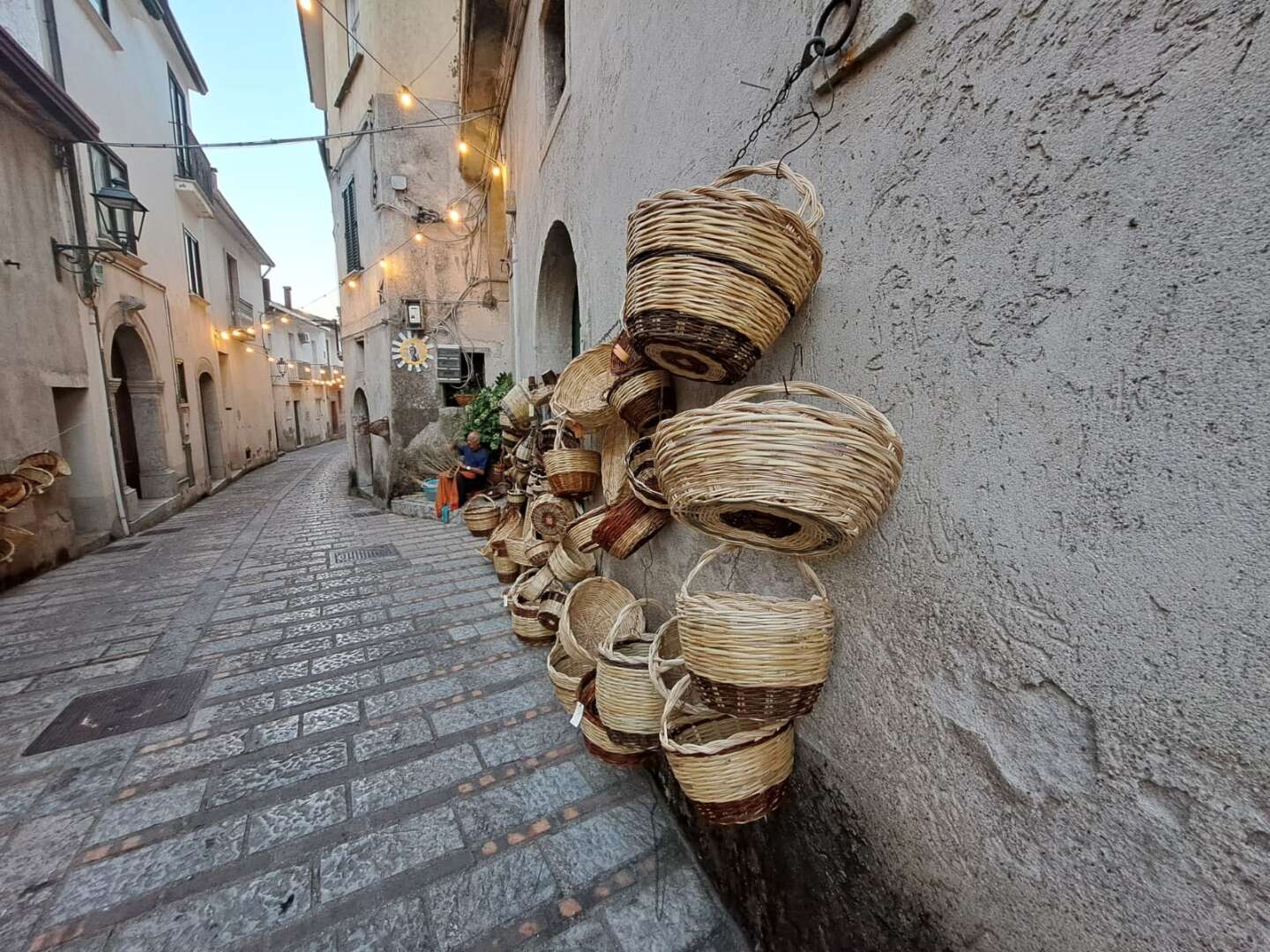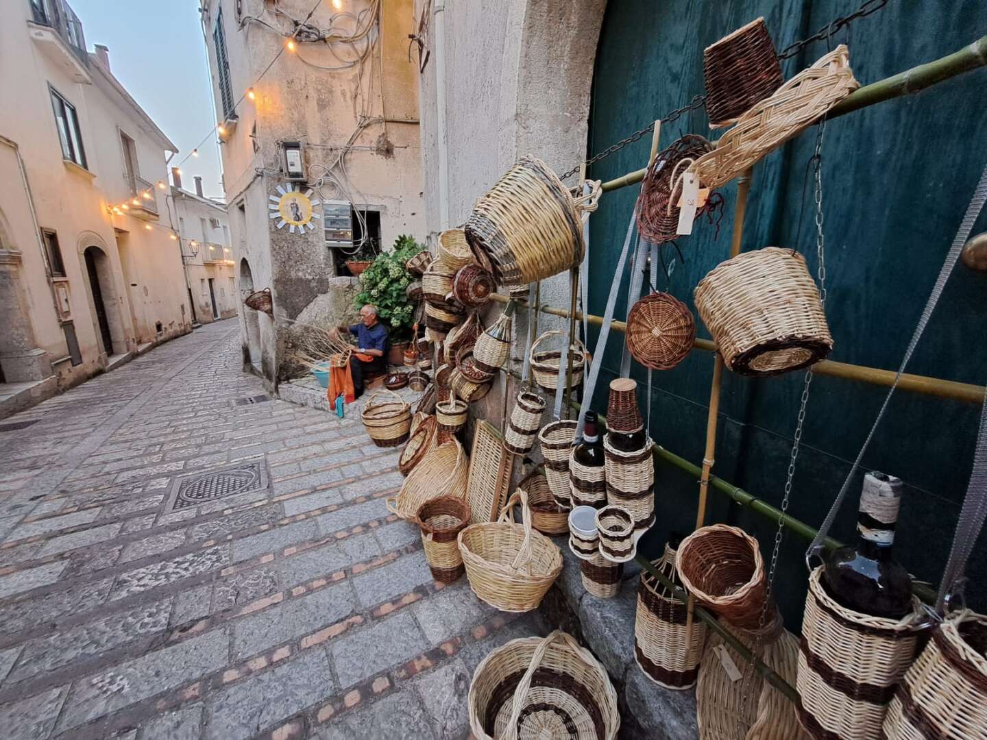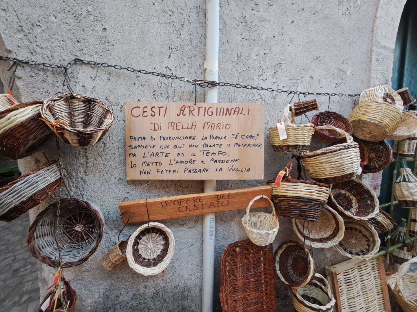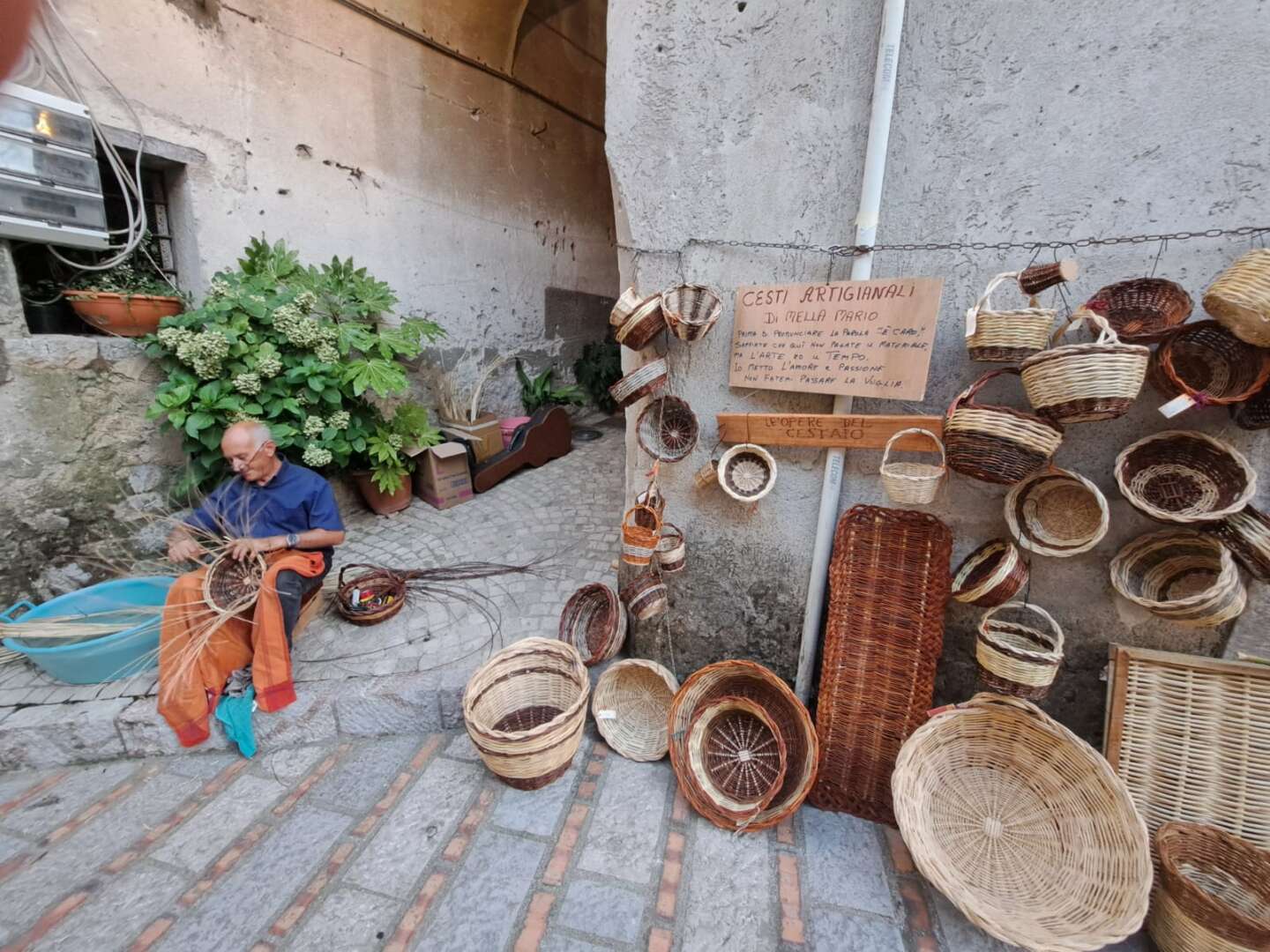 Proseguendo nella camminata, immergendosi nel cuore del centro storico, ecco le opere del cestaio Di Mella Mario, che ricorda ai passanti, magari indecisi per un acquisto “non è il materiale che si compra, ma è il tempo che un artigiano o un artista impiega per creare”.
