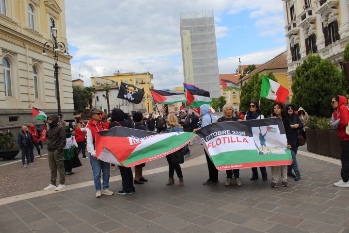 In centinaia hanno manifestato a Benevento in difesa della popolazione palestinese e dei valori costituzionali con un invito alla cessazione del genocidio anche dopo quello che è accaduto alla Global Flotilla bloccata in acque internazionali mentre tentava di portare viveri ad una popolazione palestinese sempre più stremata. Solidarietà per gli abitanti nella Striscia di Gaza, contro l’attacco senza regole e remore alla popolazione civile. La nuova protesta è scattata dopo un abbordaggio in acque internazionali che ha impedito di portare derrate alimentari al popolo martoriato di quell’area territoriale dilaniata dai conflitti che affaccia sul Mediterraneo. Alla protesta nel capoluogo sannita hanno preso parte associazioni e tanti giovani e anche alcuni consiglieri comunali come Giovanna Megna , Angelo Miceli, Raffaele De Longis, Francesco Farese. Presente il segretario provinciale del Pd Giovanni Cacciano e la presidente democrat Rosa Razzano.