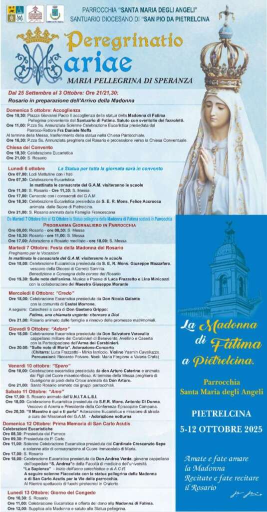 Dal 7 al 13 ottobre, la statua sarà esposta nella Chiesa Parrocchiale “Santa Maria degli Angeli” – Santuario diocesano di “San Pio da Pietrelcina”, chiesa giubilare che consente ai fedeli di ottenere l’indulgenza plenaria. L’evento prevede un ricco programma di preghiere e celebrazioni, tra cui l’Eucaristia solenne di domenica 12 ottobre, presieduta dal Cardinale Crescenzio Sepe. Diversi vescovi parteciperanno alle celebrazioni durante la settimana. La visita vuole portare un messaggio universale di pace. Assume un significato particolare a Pietrelcina per il legame storico con San Pio, che testimoniò di essere stato guarito nel 1960 dopo aver pregato davanti a questa sacra icona a San Giovanni Rotondo.